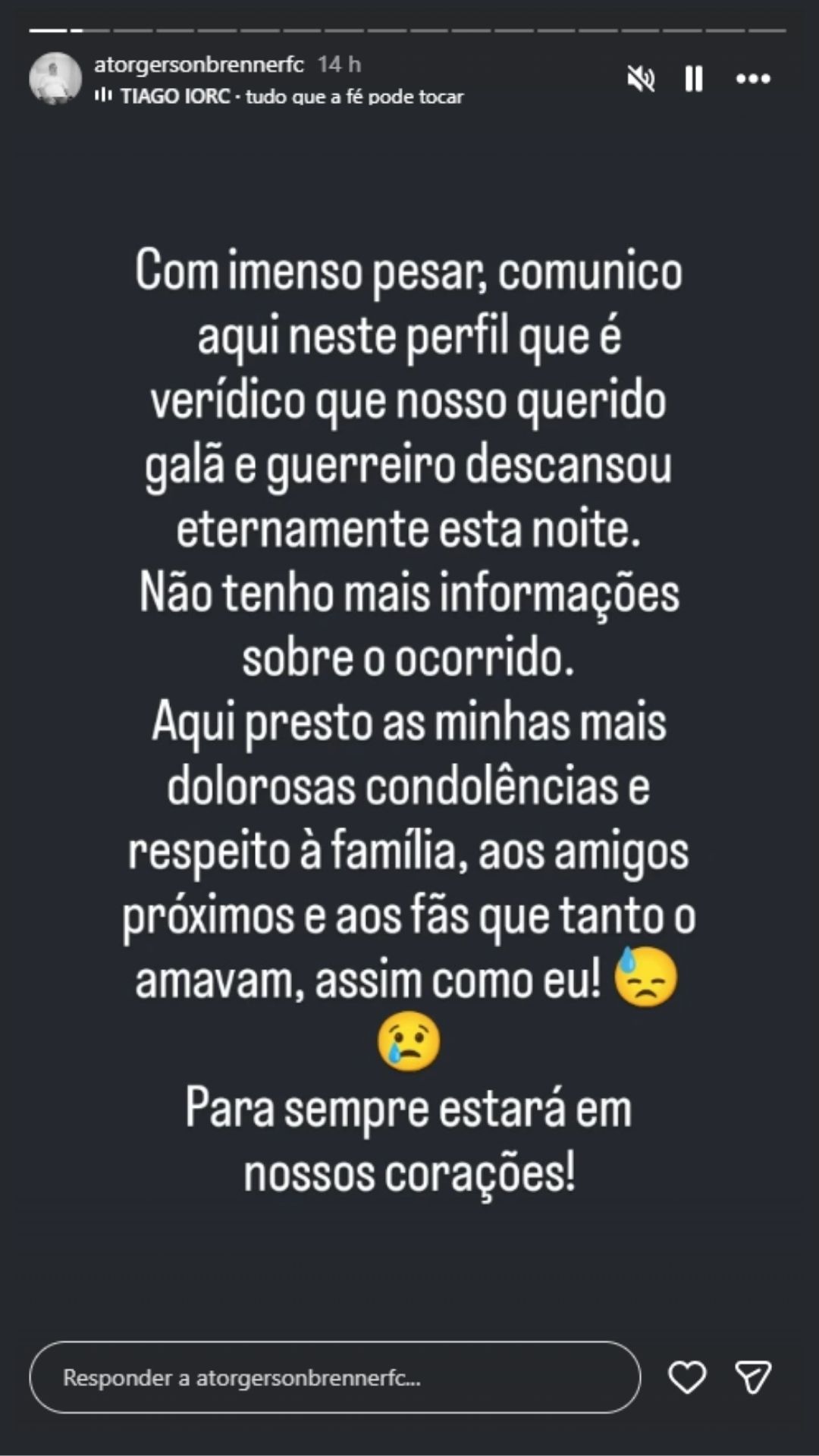 Na rede social de Gerson várias homenagens foram postadas, além do comunicado do ocorrido.