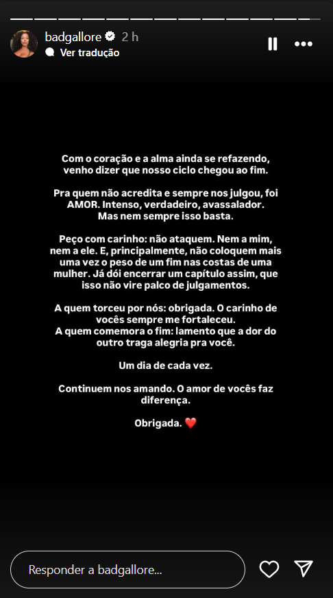 Antes, no story, ela dizia estar com o coração e a alma se refazendo e que nem sempre somente o amor intenso, verdadeiro, avassalador bastava. Os dois têm um filho: Rás.
