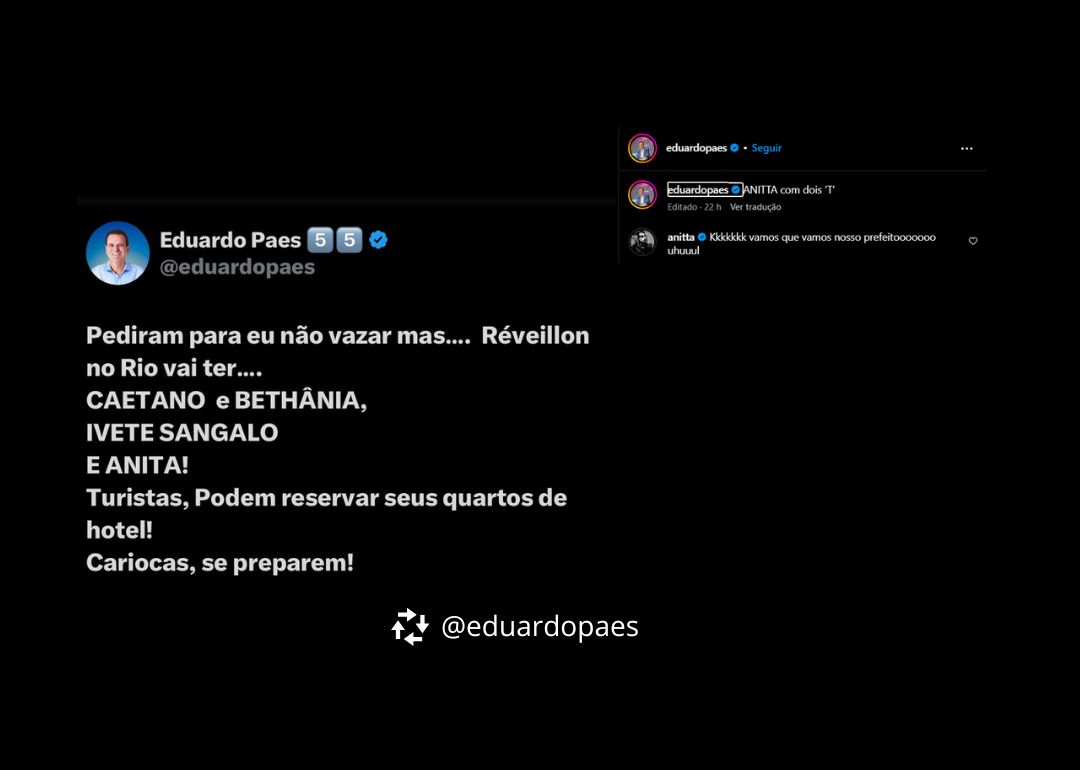 Você acreditam que ainda tem gente ainda reclamando do show da Madonna? É…. Mas isso é assunto para um outro momento. O assunto de agora é o show da virada de 2024 para 2025. O prefeito do Rio anunciou de uma vez só: Caetano Veloso e Maria Bethânia, Ivete Sangalo e Anitta (no post com 1 T, depois consertando com 2 T’s). Se queriam mais um motivo para começarem o ano reclamando o prefeito já deu. Eu vou é comemorar e você?